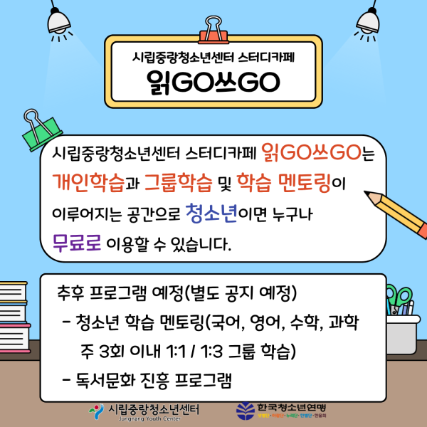 시립중랑청소년센터는 청소년들이 자유롭게 이용할 수 있는 전용학습공간인 스터디카페 읽GO쓰GO를 오픈합니다.